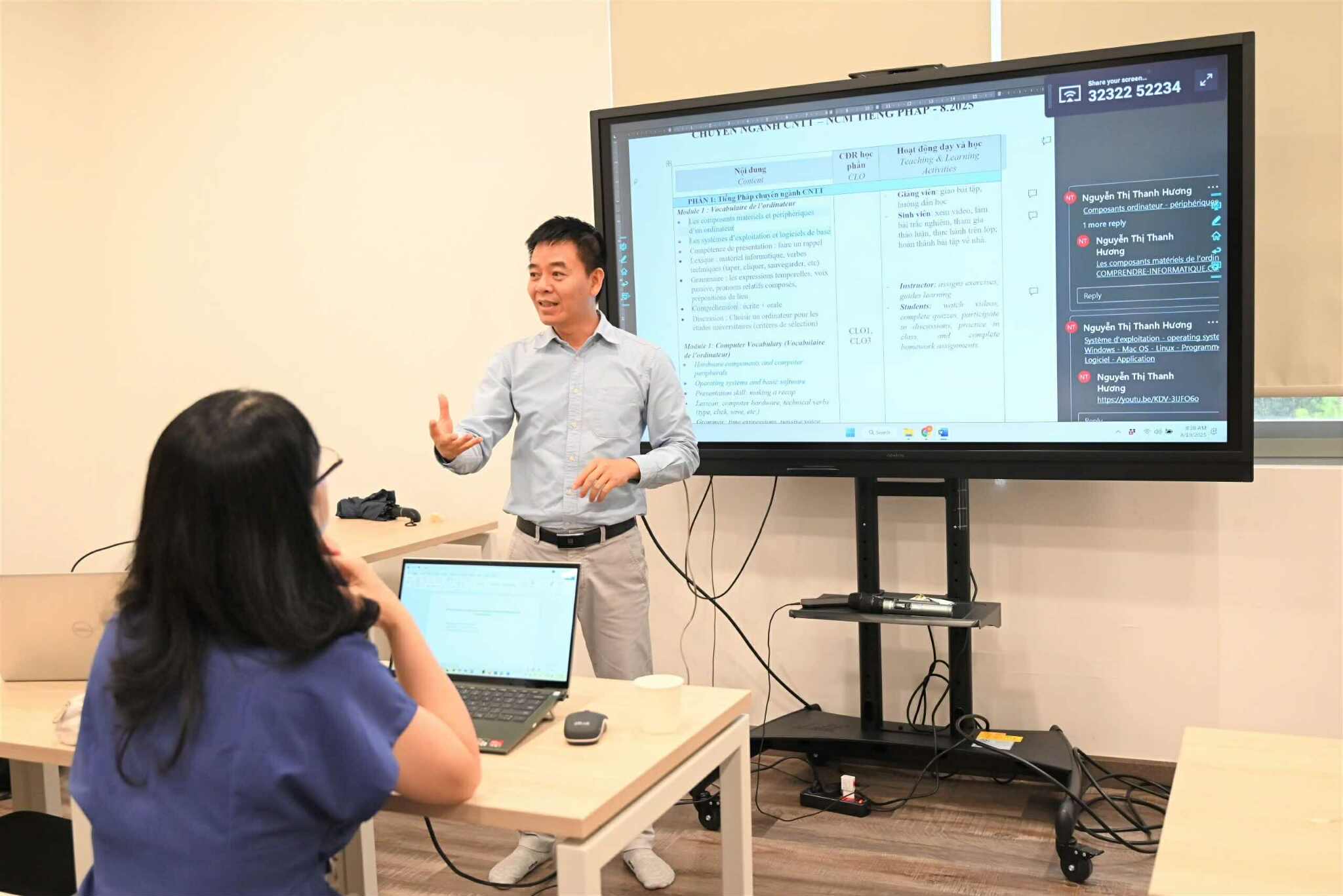 Animée par le Dr NGUYEN Van Toan, spécialiste de l’intégration des technologies éducatives, la session a offert un programme dense et varié. Les participants ont été initiés aux multiples usages de l’intelligence artificielle pour l’enseignement du français de spécialité : analyse et traitement automatisé de textes, de sons et de vidéos, conception d’activités grammaticales et lexicales interactives, ainsi que création de modules adaptés aux besoins spécifiques des étudiants en informatique.