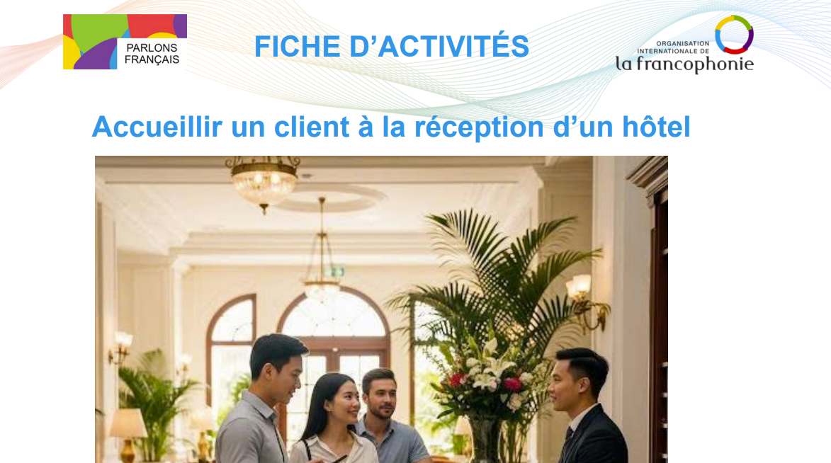 Séries d’exercices complémentaires de la méthode “Objectif diplomatie 1” éditée par Hachette FLE : communiquer au quotidien dans un contexte professionnel : apprenez à saluer dans un contexte professionnel, organiser…
