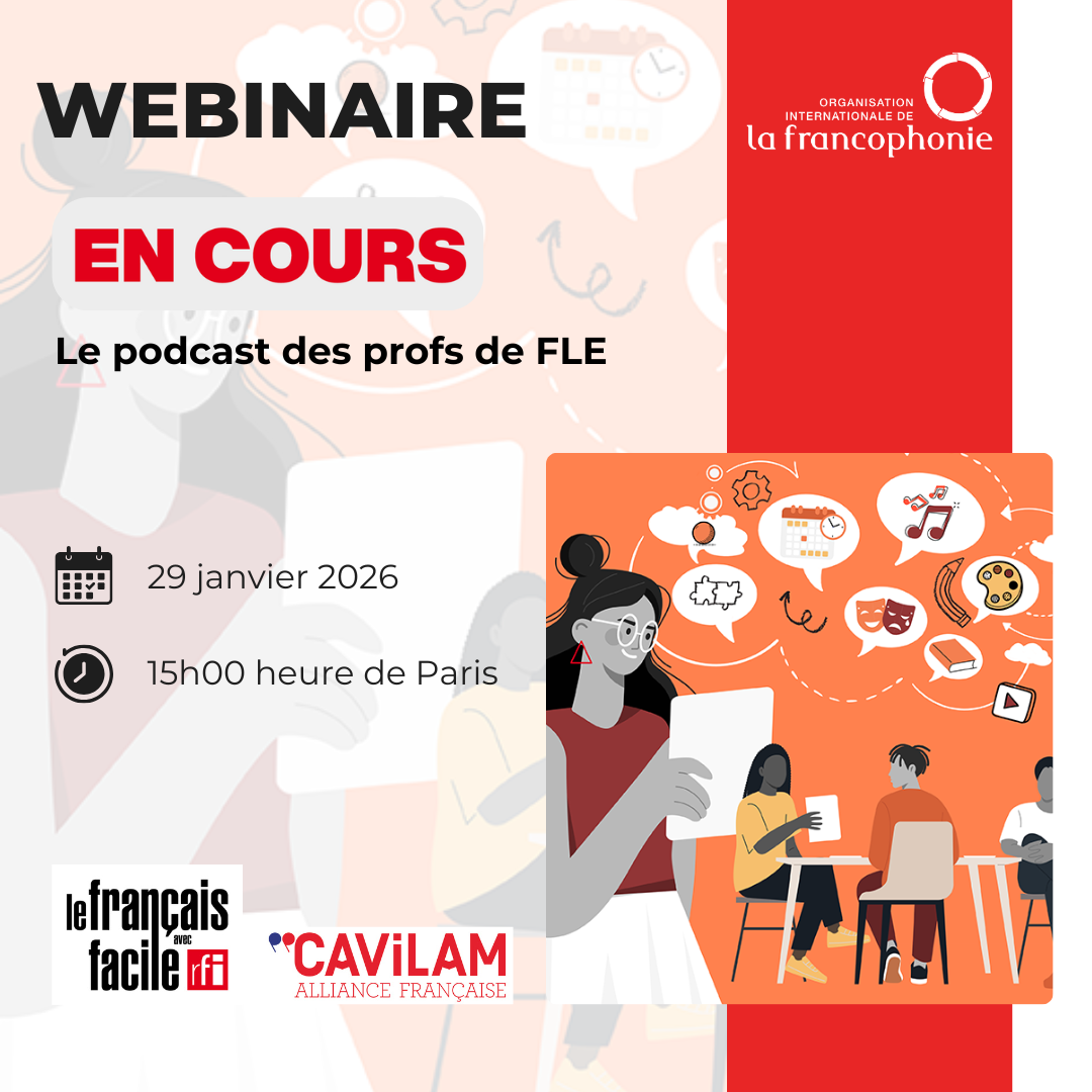 Dans le cadre de son cycle « Les webinaires des profs de FLE », l’OIF a le plaisir de vous inviter au webinaire #18 consacré au podcast “En cours” produit par RFI en collaboration avec le CAVILAM – Alliance française.